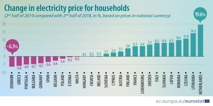 Highest increase in electricity prices in the Netherlands and Lithuania, largest fall in Denmark and Greece