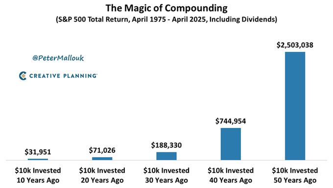 If you invested $10,000 in the S&P 500 10 years ago, you would have $31,951 today. 20 years - $71,026 30 years - $188,330 40 years - $744,954 50 years - $2,503,038