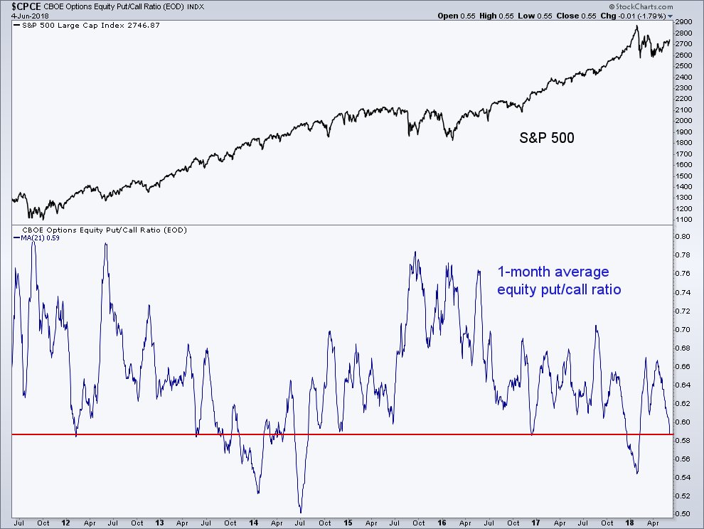 The S&P 500 vs. the 1-month average put/call ratio. Are