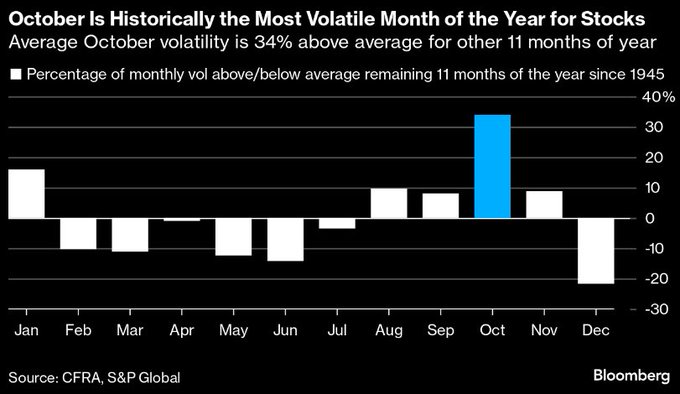 Since WWII, average volatility for U.S. stocks in October is 34% above average for other 11 months of year per CFRA