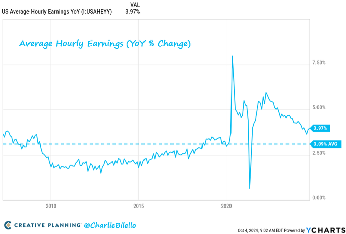 Average Hourly Earnings in the US increased 4% over the last year, well above expectations for a 3.7% increase. The CPI Inflation Rate will likely fall to 2.3% in September, meaning a 1.7% positive spread of wage growth over price increases, the highest we've seen in years.