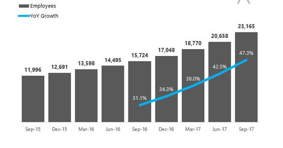 Facebook now has 23,165 employees. That's a 43% increase from this time last year