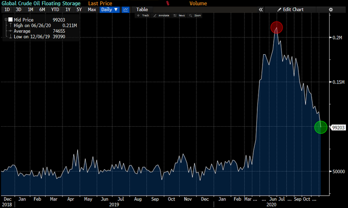Global crude oil floating inventories last week dropped below the 100 million barrels for the first time since mid-April