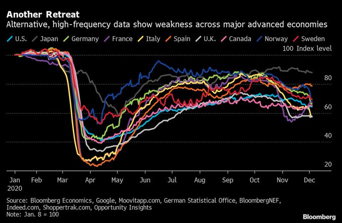 Alternative, high-frequency data show that activity in several of the world’s largest advanced economies slid at the beginning of December, reflecting a surge in the rate of Covid-19 infections and stricter containment measures