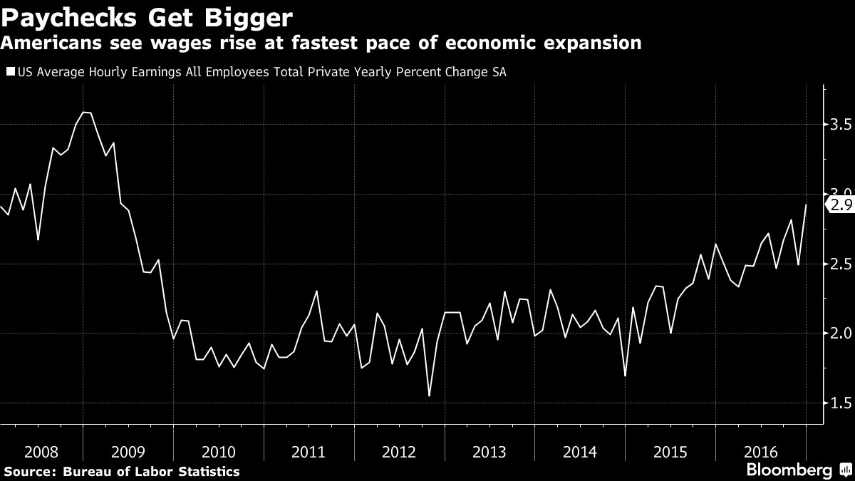 Hourly earnings in the US are growing at their fastest rate SINCE 2009. This Bloomberg chart