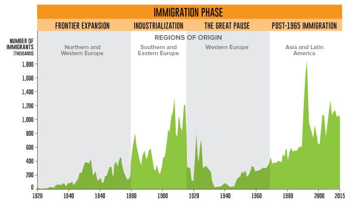 This graphic shows 200 years of US immigration as the rings of a growing tree trunk