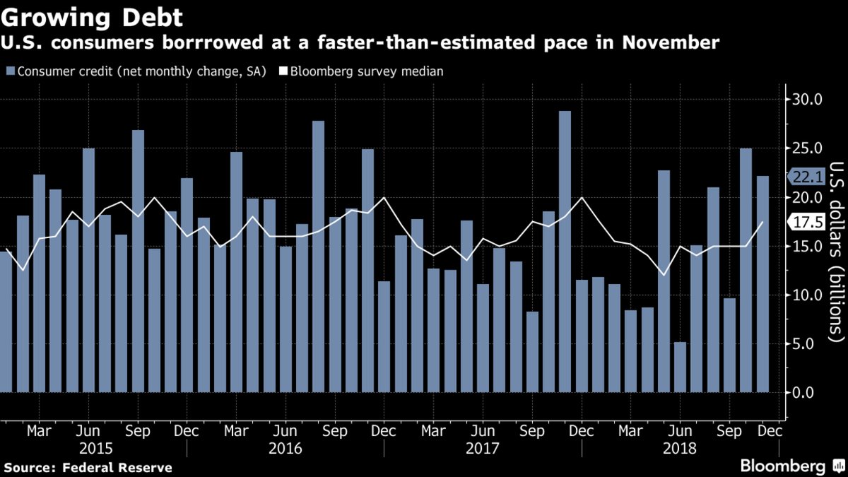 U.S. consumer debt rose in November at a faster-than-estimated pace as Americans continued to borrow to finance purchases