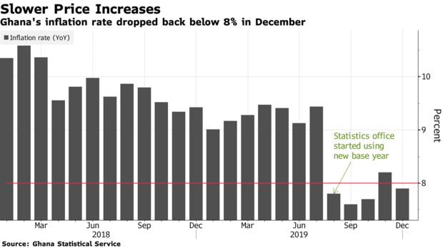 Ghana beat the government’s inflation target for 2019 as food-price growth eased