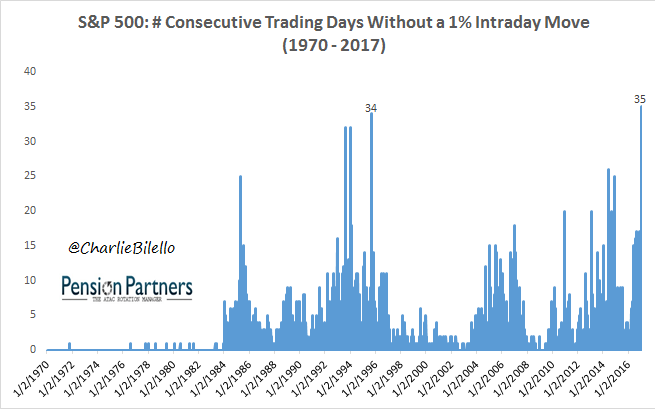 The S&P 500 hasn't made a 1% intraday move in 35 DAYS. That's a record