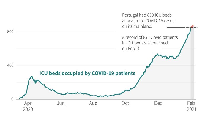 Health Ministry data showed that, out of 850 ICU beds allocated to COVID-19 cases on Portugal’s mainland, all were now occupied.