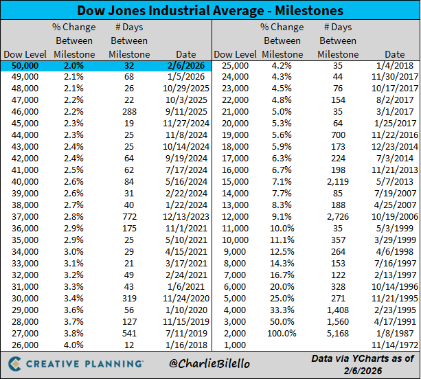 The Dow just crossed above 50,000 for the first time, its 22nd 1,000-point milestone of the roaring 20s decade.