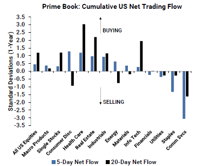 Hedge funds are buying consumer discretionary, healthcare, real estate, industrial, energy and materials stocks over the last five trading days