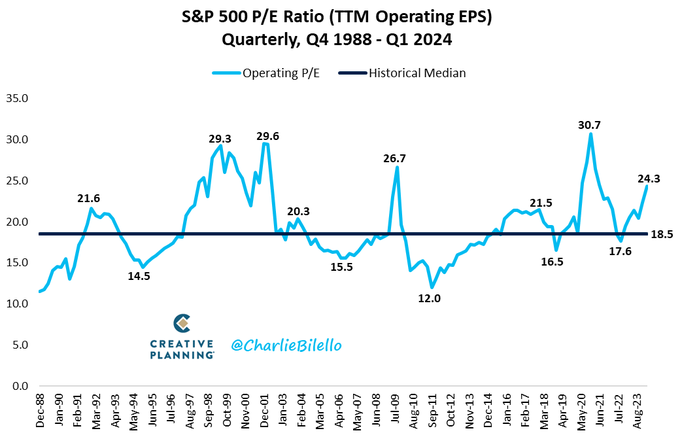 The S&P 500's P/E ratio moved up to 24.3 in the 1st quarter, which is 31% above the median P/E ratio since 1988 (18.5).