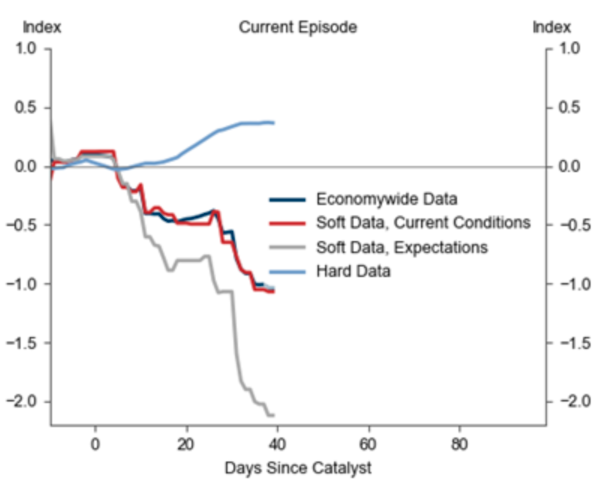 There remains a rather stark divergence between leading measures of hard data vs soft data on the economy, per Goldman