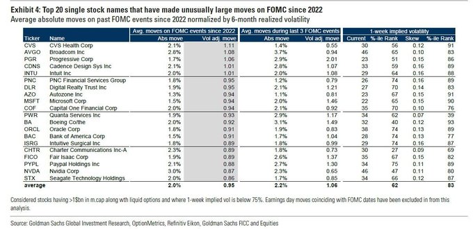 The top 20 stocks that tend to have unusually large moves on FOMC day since 2022, per Goldman