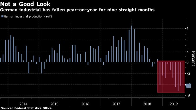 German industrial production unexpectedly declines as trade tensions and waning business confidence continued to weigh on global demand