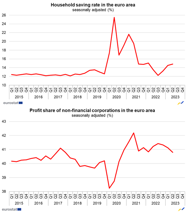 Euro area household saving rate up to 14.8% and business profit share decreases to 40.8% in Q2 2023