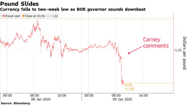 The pound fell to a two-week low as outgoing Bank of England Governor Mark Carney signaled that an interest-rate cut could still be on the horizon