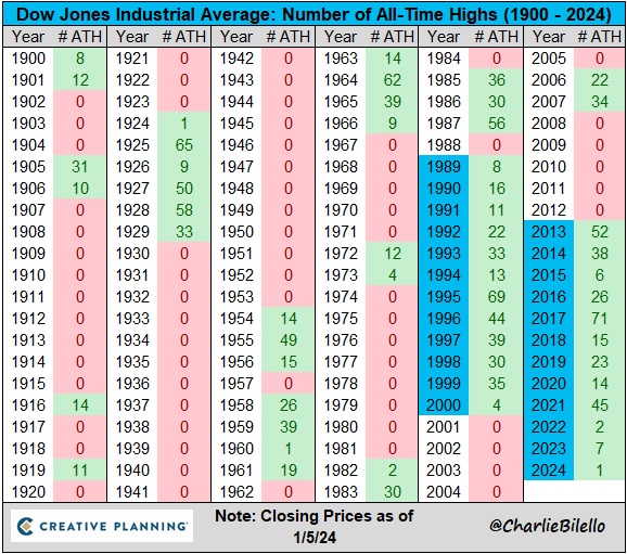 The Dow's streak of consecutive years with at least 1 all-time high hit 12 when the Dow closed at an all-time high on the first trading day of 2024. This ties the record run from 1989 to 2000