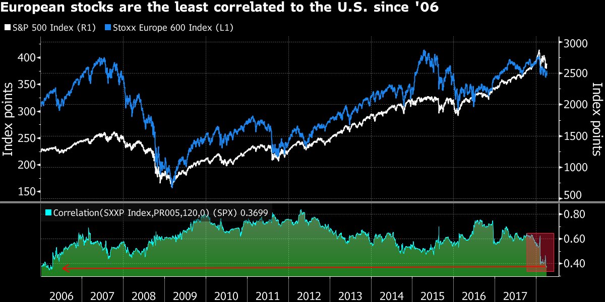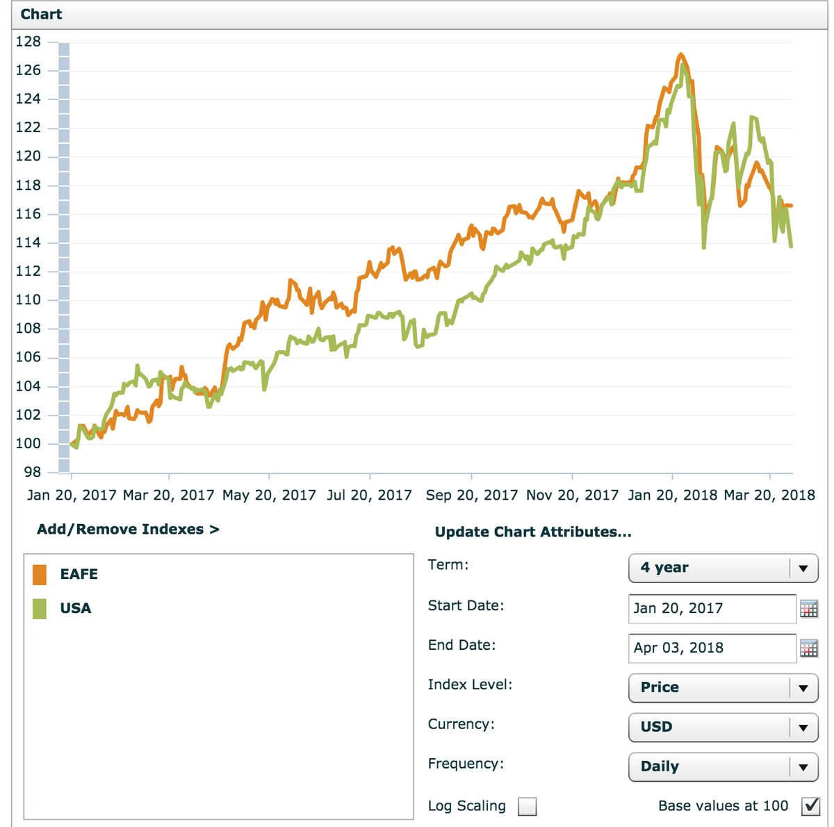 And here is a comparison of US stocks to stocks in the rest of the developed world excluding North America (MSCI EAFE index)