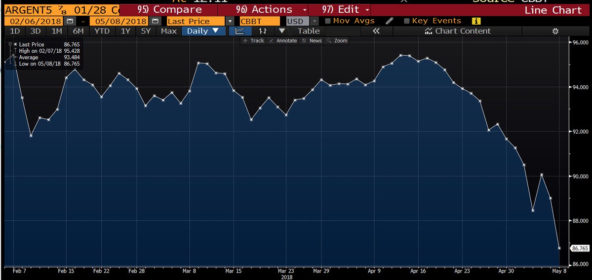 Argentina is in talks with the IMF for a $30 billion credit line as the nation's bonds, stocks & currency all plunge. Its 10-year debt is now yielding close to 8%, from 6.5% earlier this year as prices fall to 87 cents on the dollar