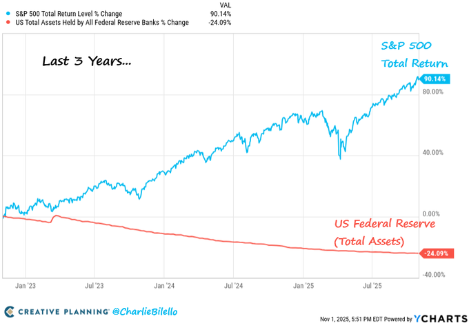 The Fed's balance sheet has shrunk 24% over the past 3 years while the S&P 500 has advanced 90%, dispelling the myth that the stock market is dependent on QE to rise