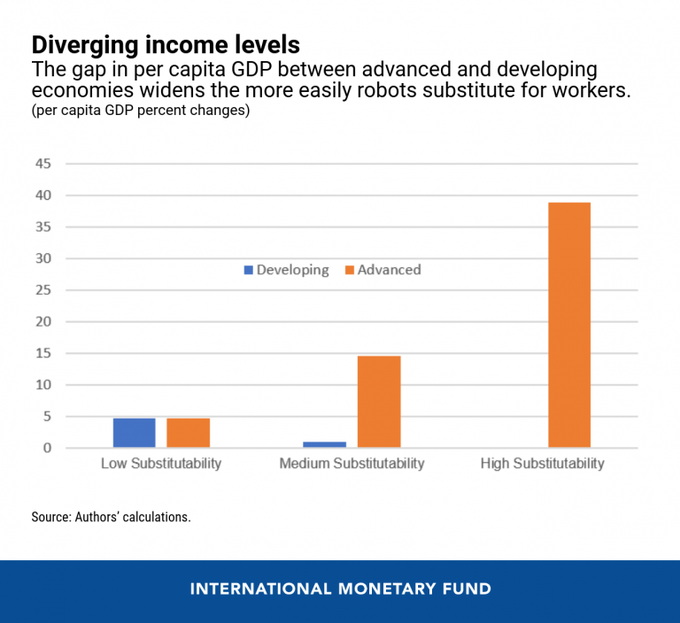 The gap in per capita GDP between advanced and developing economies could widen the more easily workers are replaced by automation