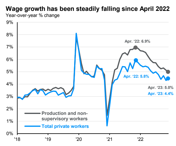 Wage growth has been steadily falling since last year, which is one factor helping to reduce upward price pressures