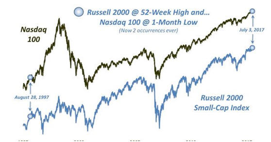 The Russell 2000 and Nasdaq-100 are trading in a way that's almost NEVER happened before