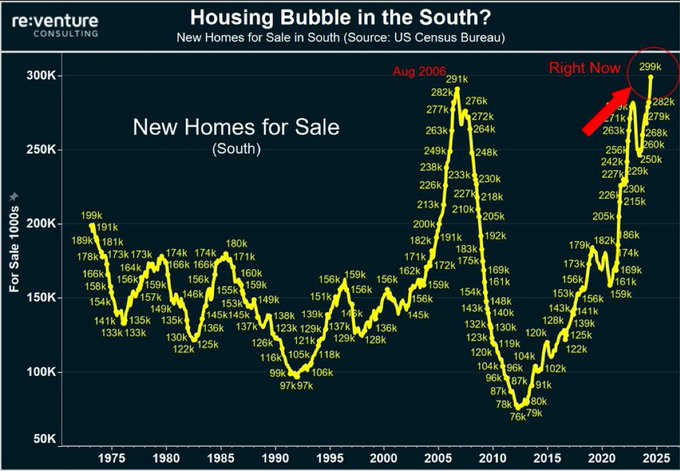 The number of new homes for sale in the USA South (FL, GA, TN, TX, etc.) has spiked up to nearly 300,000