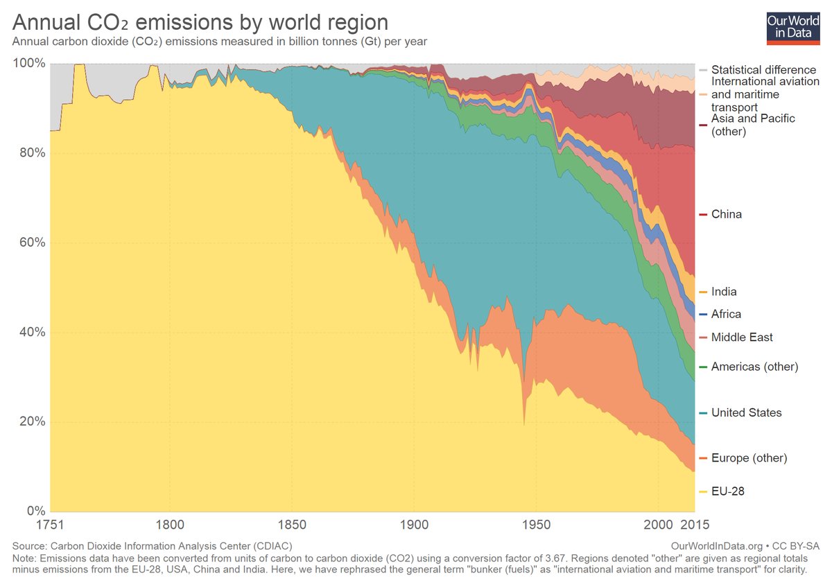 In 1945 USA produced 53% of global emissions, today 15%. In absolute terms the US doubled its emissions