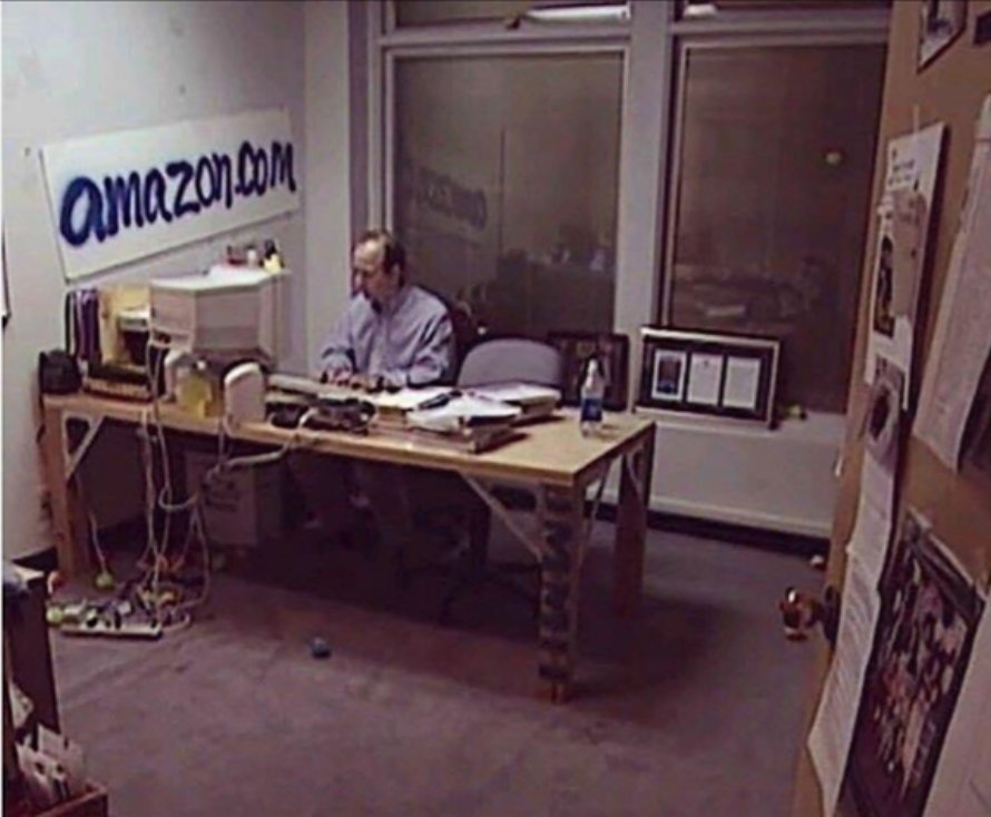This is a picture of Jeff Bezos in his first Amazon AMZN office
