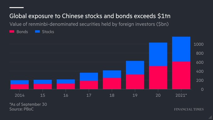 International investors held Rmb7.5tn ($1.1tn) of equity and fixed income securities priced in renminbi as of the end of September, up about Rmb760bn from the end of 2020, according to Financial Times calculations