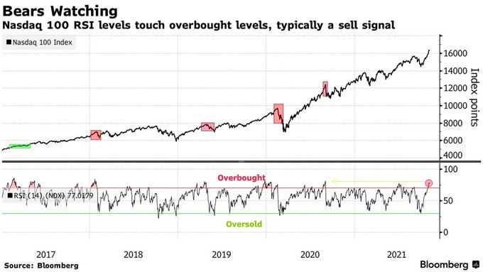 The tech-heavy Nasdaq 100 Index shows signs of overheating