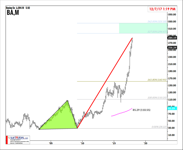 Boeing traded (the previous week) as high as $284.79 today. That's an ALL-TIME high. Boeing is up 81% this year and the chart is incredible
