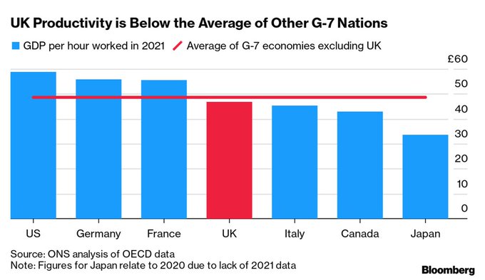 Britain was less productive than its G-7 economic peers the US, Germany and France in 2021