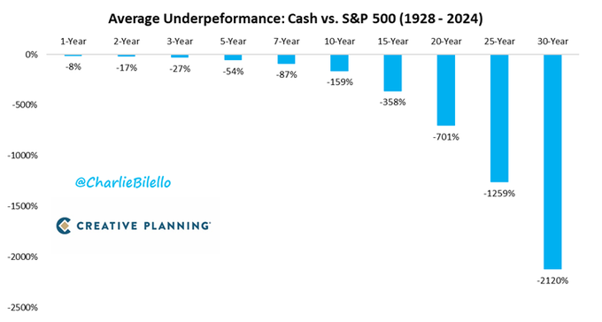 Over one-year periods, the average cost of holding cash has been roughly 8%. But over 30-year periods, this grows to more than 2,000%. Cash is NOT King