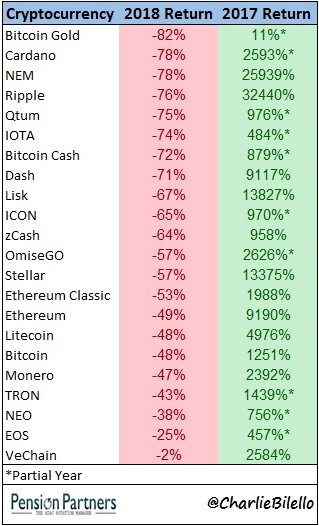 Every major cryptocurrency is down in 2018 with average return of -58%