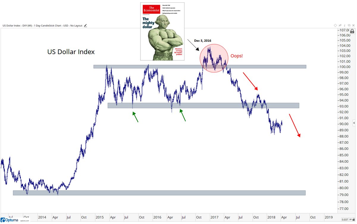 This is why you can never ignore the magazine cover indicator. You're looking at a cover of the Economist vs. the US Dollar