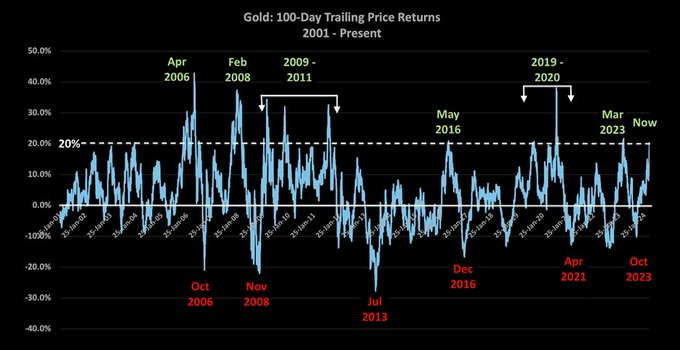 The 100-day trailing price returns in gold have been rather unusual in their strength. Some argue this means the metal is becoming exhausted. But, positioning and sentiment argue this could be early innings for the metal
