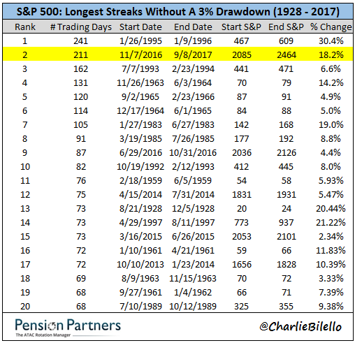 S&P 500 has not had a 3% drawdown in 211 trading days, the