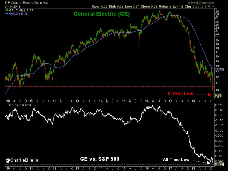 General Electric closes at a 9-year low, relative strength