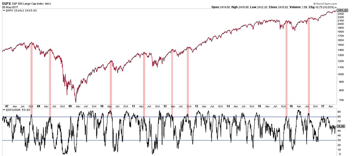 Nearly every major drop in SPX the past 10 yrs started when 80-90% of stocks were in an uptrend