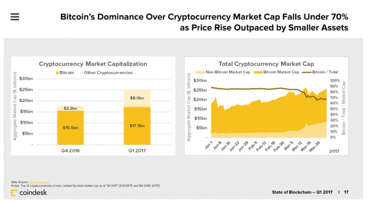This chart shows how fast altcoins (Ripple, Ethereum, Litcoin, etc) are growing compared to Bitcoin
