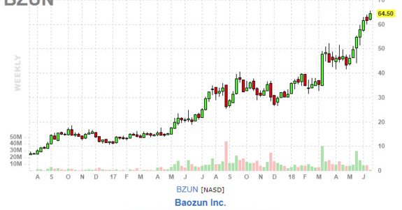 This is a chart of Baozun BZUN. It's another Chinese tech stock that's ripping higher this year. It's already up 96% YTD