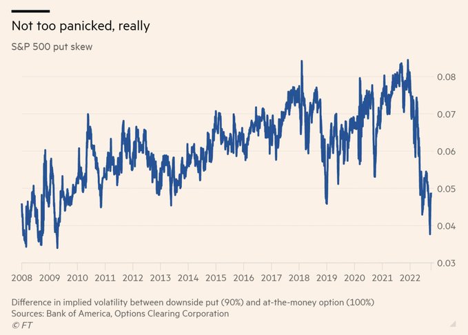 S&P 500 put skew—what investors will pay for protection against large equity declines relative to small declines (additional cost of insuring against major drop in stocks)—has been falling all year