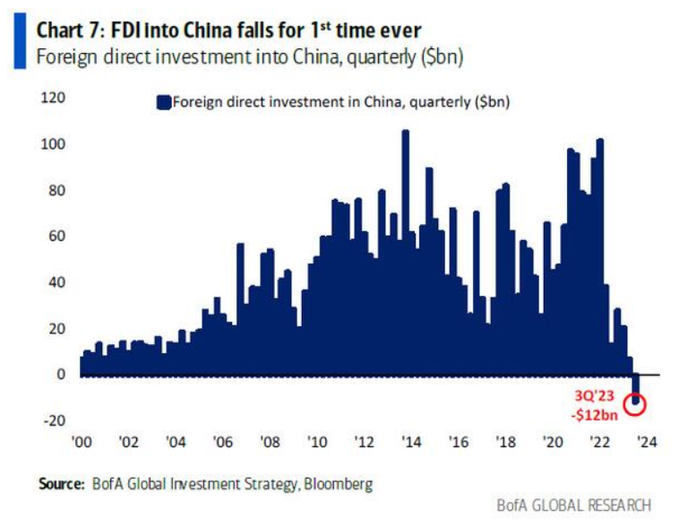 Foreign direct investment into China fell for the first time ever in Q3 2023