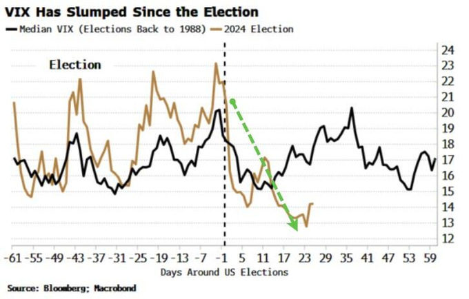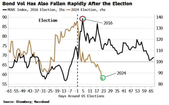 Bond market volatility has also fallen rapidly after the election, per the MOVE index