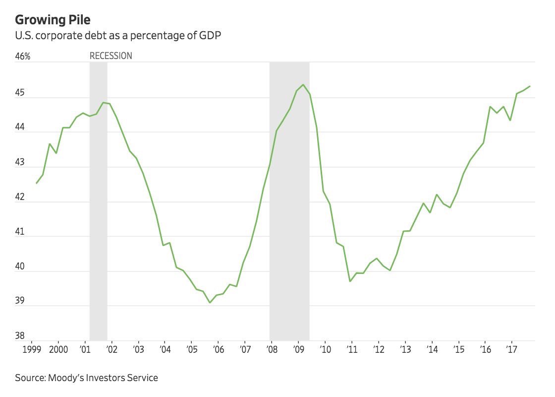 This is US corporate debt as a percentage of GDP. It’s at its highest levels since 2008 (also look where it was during the DotCom Bubble)