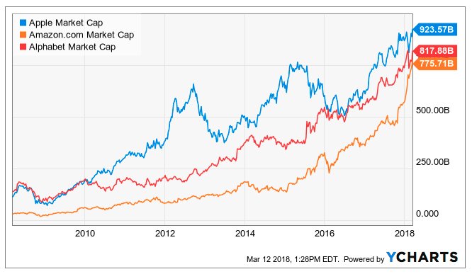 This is the race to $1 trillion. You're looking at the market caps of Apple vs. Amazon vs. Alphabet (Google)